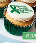 Delicious Mental Health Awareness week vegan cupcakes! The perfect excuse to get people chatting about mental health over a cuppa. Each vegan cupcake baked in a silver case, topped with a hand piped vegan buttercream swirl and Mental Health Awareness ribbon design.